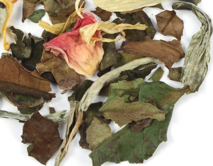 White Tea, Gunpowder Tea, Jasmine Chun Hao Tea, Natural Pineapple Flavor, Natural Peach Flavor, Rose Petals & Marigold Flowers